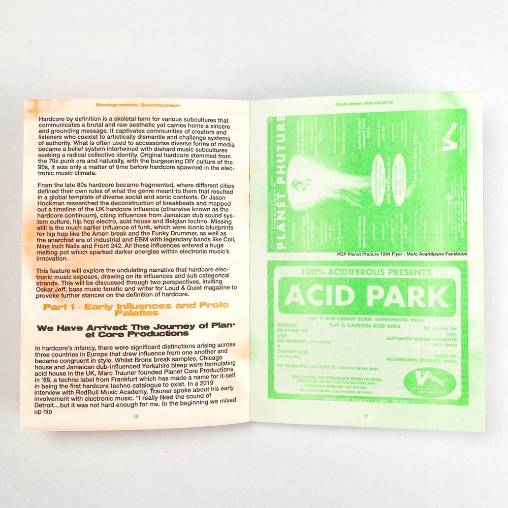 Biodegradable Soundsystem is a series of essays, features, and interviews navigating microclimates of old school dance music culture within the sphere of free parties, raves, club culture, and experimental sonics. The project maps the evolution of electronic music along the hardcore and psychedelic spectrums, tracing countercultural roots from Spiral Tribe and UK acid house to dub sound systems, early trance, and the many splintered definitions of hardcore.